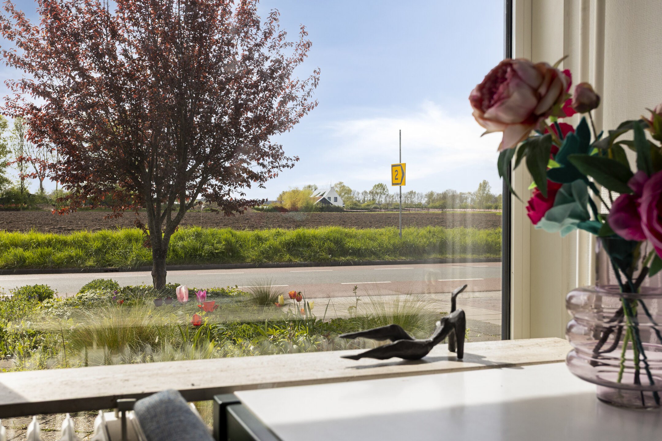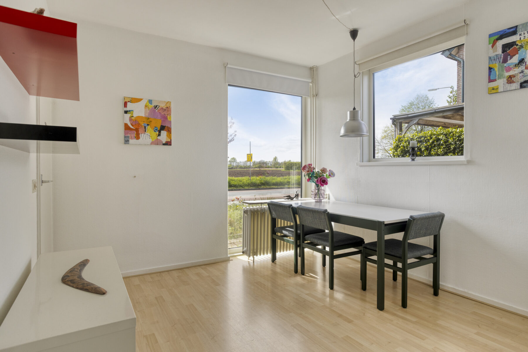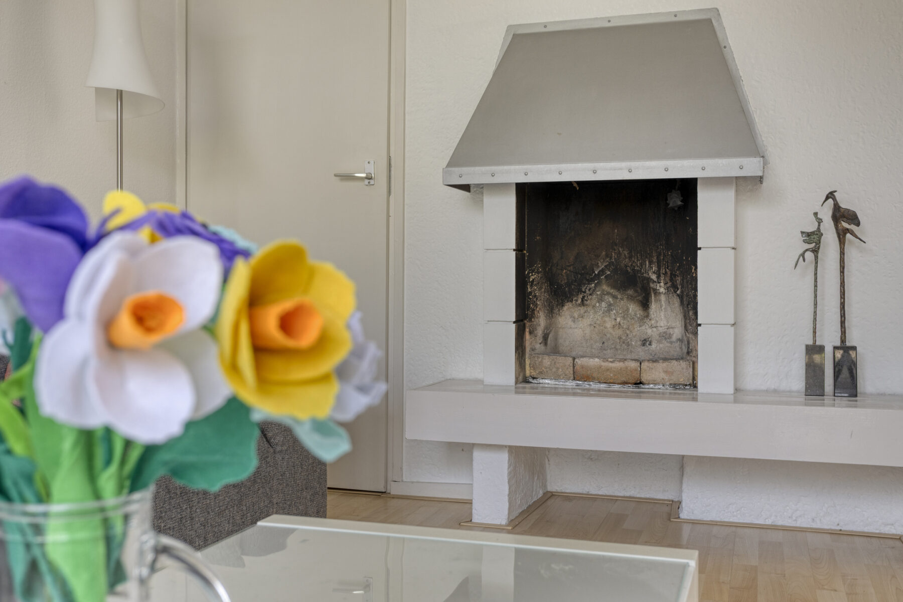 De woonkamer is een heerlijke, lichte ruimte waar je moeiteloos een ruime eettafel bij het raam plaatst. Hier geniet je dagelijks van een prachtig, vrij uitzicht over het omliggende weiland. Het zitgedeelte is extra karaktervol door de aanwezigheid van een open haard en het zicht op de tuin. Naast de open haard zit nog extra bergruimte.