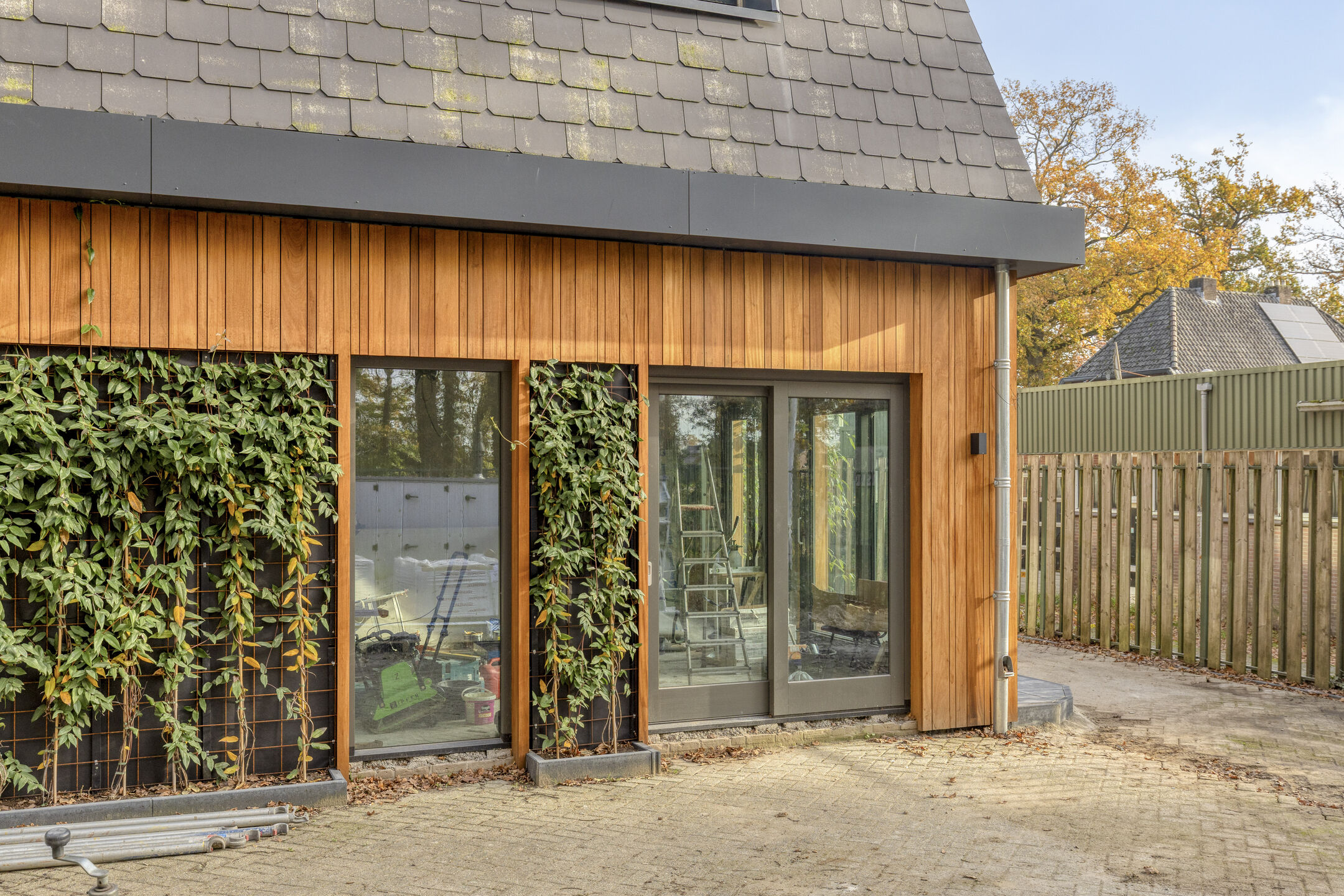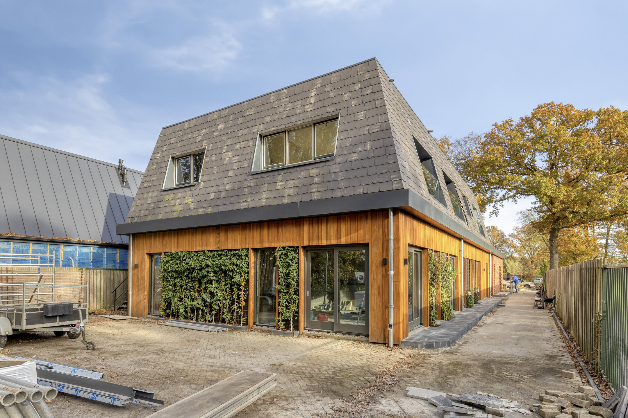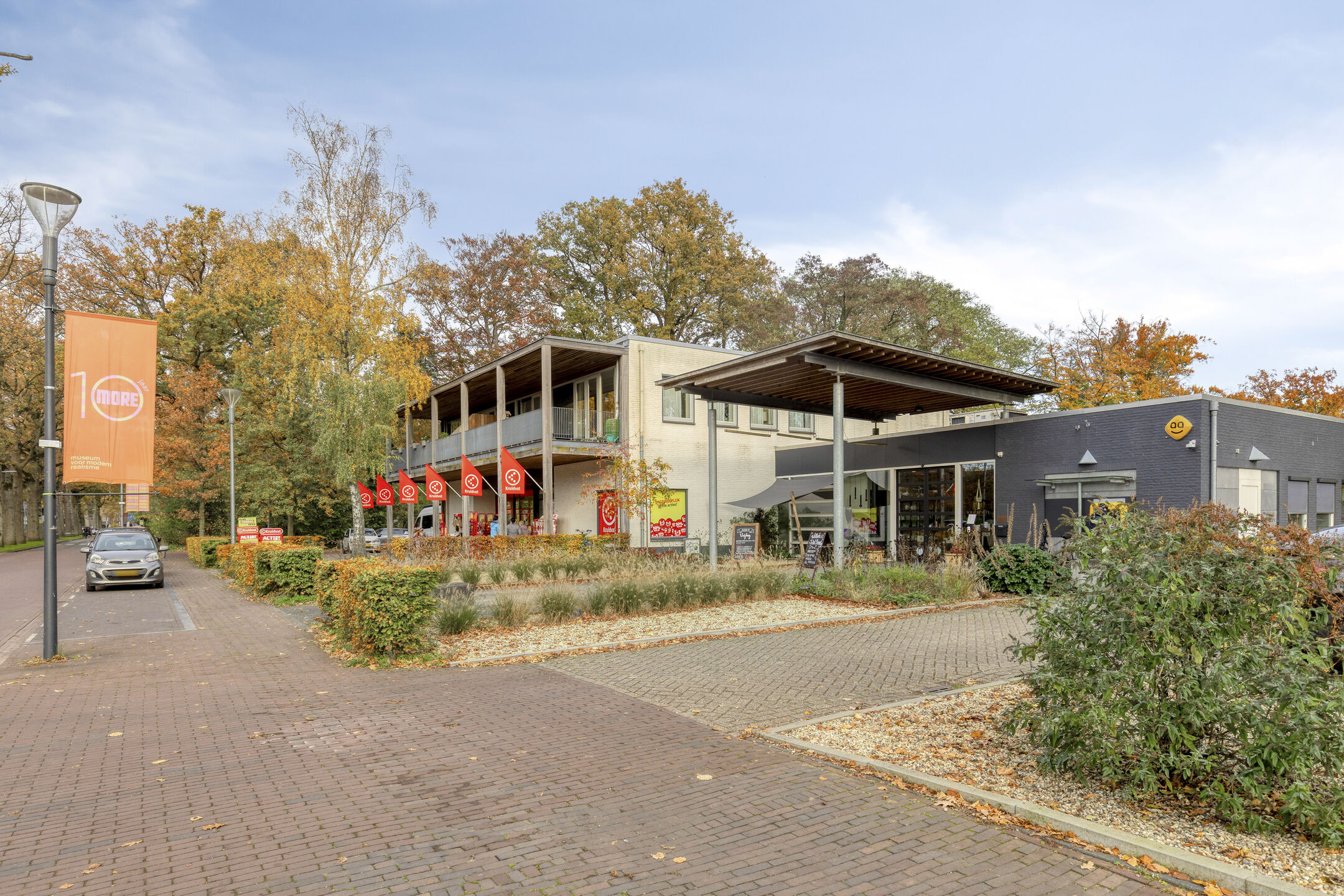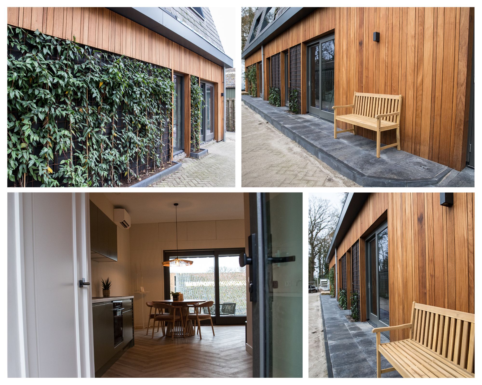 Als u vanuit de Hoofdstraat het gebouw ziet liggen valt als eerste het fraai bruinrode baksteen gevel met de strakke moderne leistenen kap direct in het oog en van iets dichterbij is de houten zijgevel met de groene en levende gevelelementen een echte “eye catcher” met haar mooie beplanting.