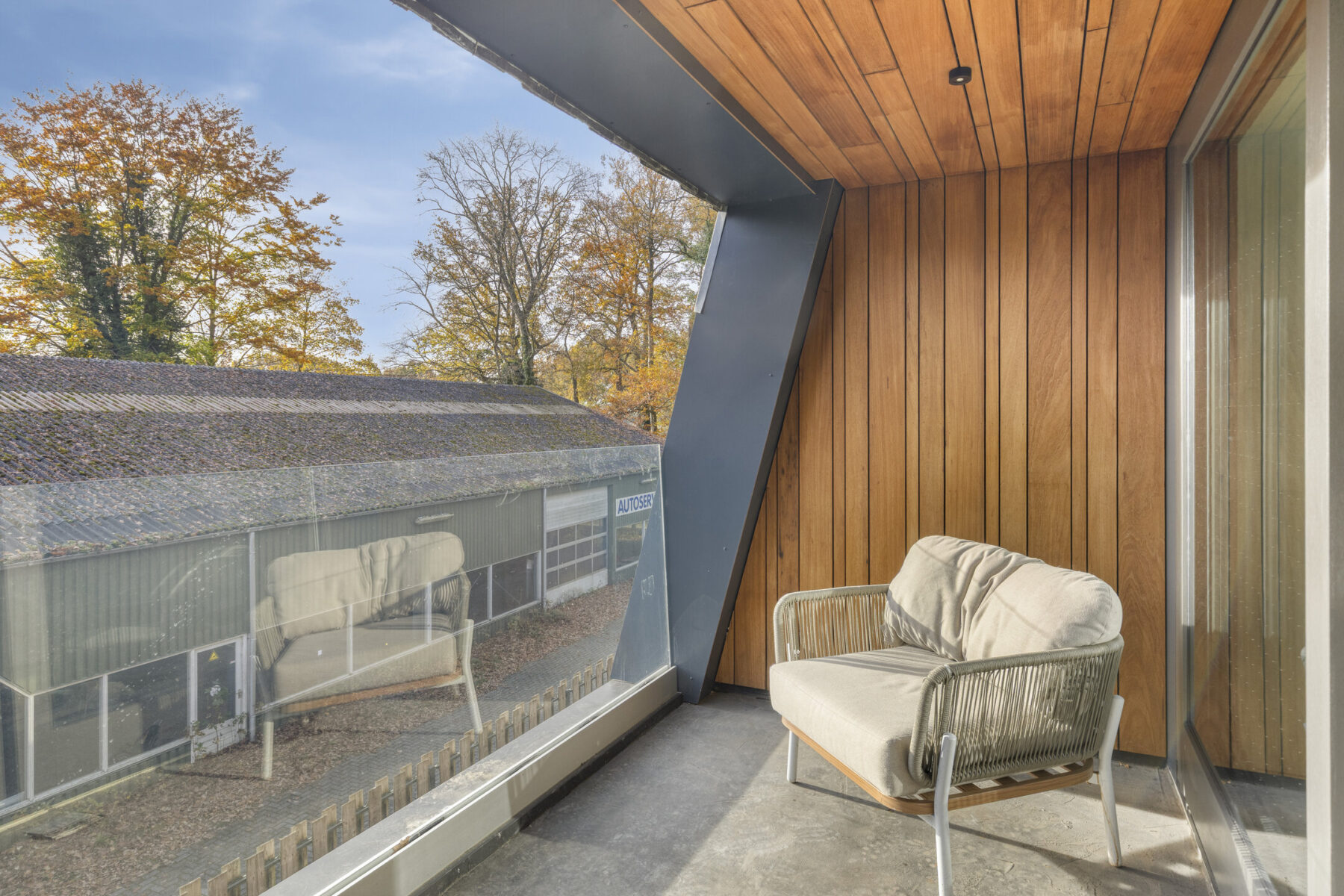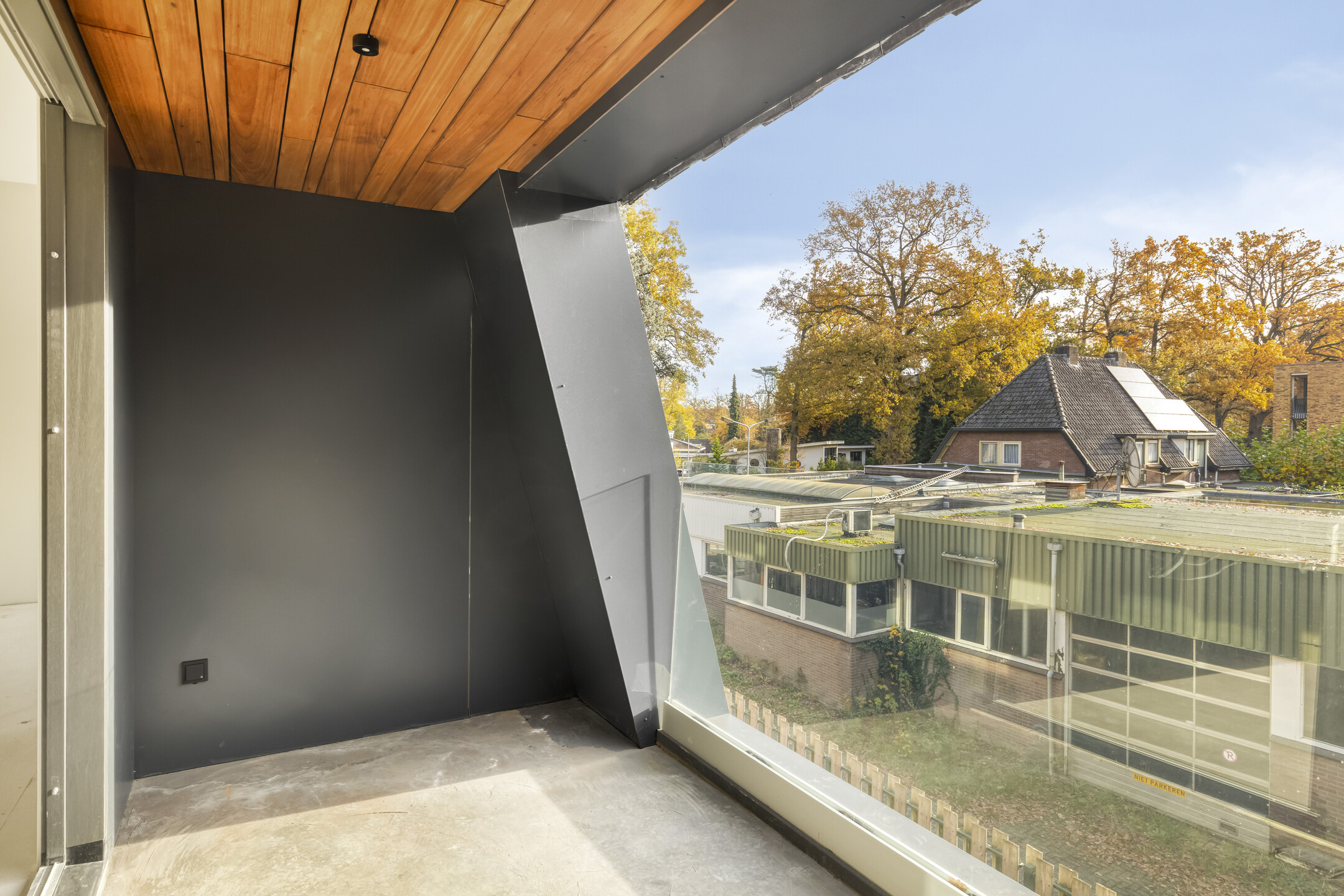 De voorzijde en de zijkant van het appartement is voorzien van veel glas waardoor u een mooi uitzicht heeft, wat tevens de zuid- en westzijde is! Er is een schuifpui naar het zonnige en overdekte loggia/balkon. Dit is bijzonder fraai afgewerkt met hardhouten bekleding aan de binnenzijde, wat zorgt voor een warme sfeer en kwalitatieve uitstraling.