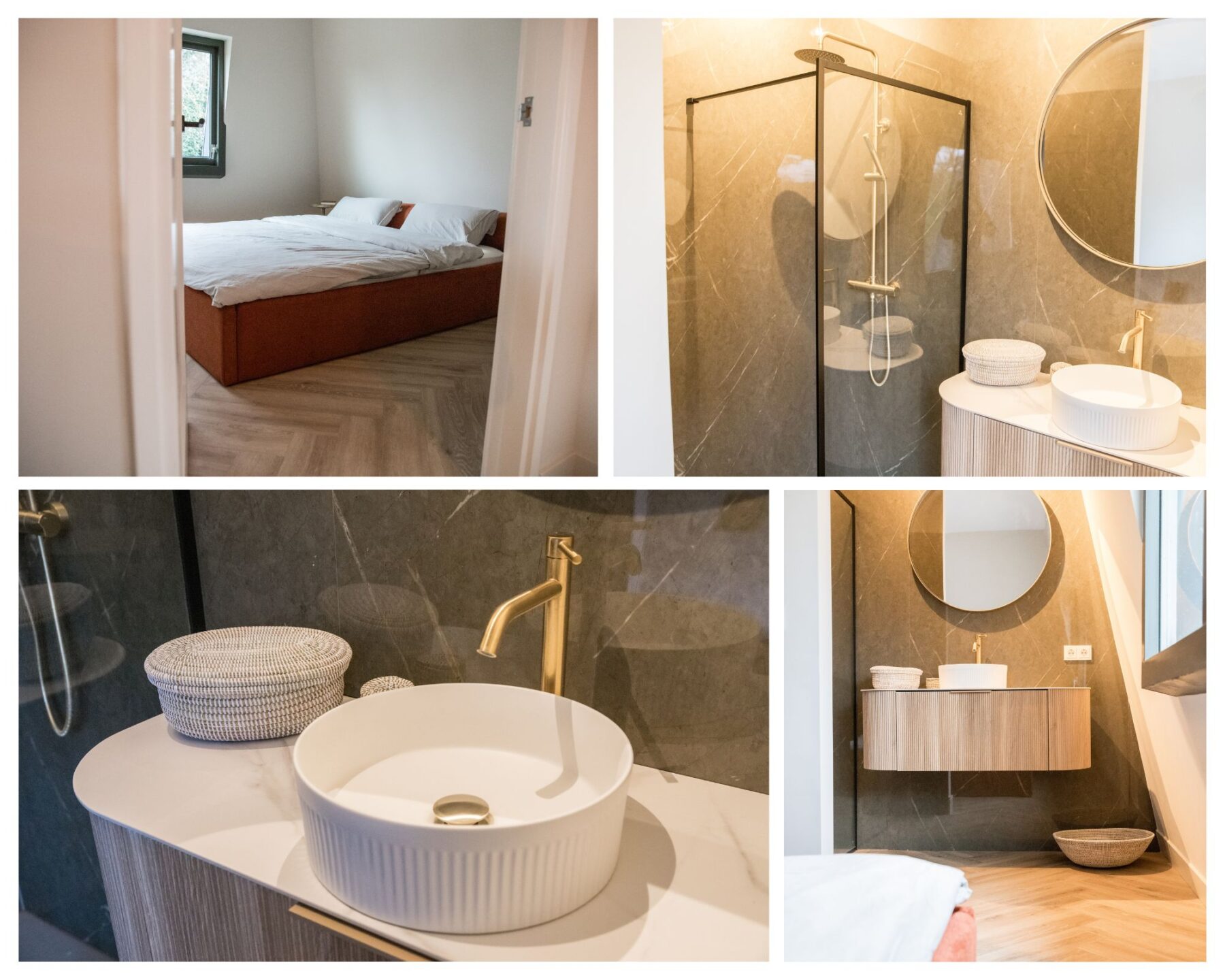 De moderne keuken is uitgevoerd met een wandmeubel met bergruimte, een combi-magnetron/oven en een koelkast, een ruim werkblad met bovenkasten en een vaatwasser en inductie kookplaat met recirculerende afzuiging. Alle apparatuur is van Bosch met 5 jaar garantie! Aan de achterzijde is een fraaie en ruime slaapkamer gesitueerd met een badkamer en-suite. Bijzonder fraai en voorzien van luxe afwerking. Een modern wastafelmeubel en een inloopdouche met goudkleurige kranen en accenten.