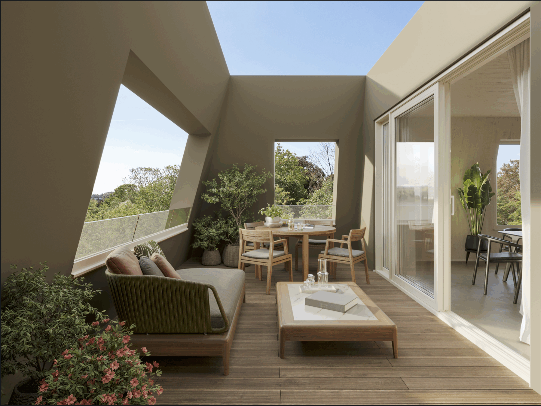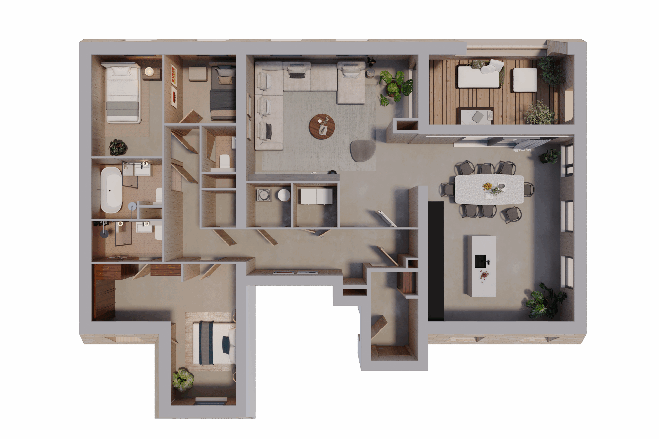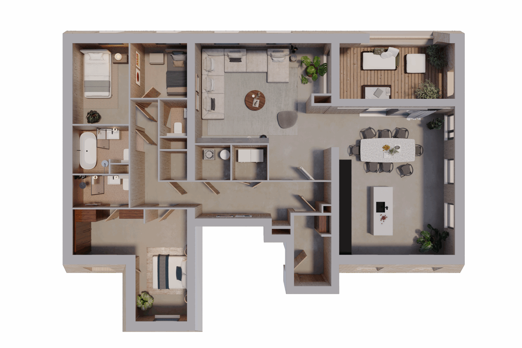 Ieder appartement is uniek en allen hebben een geheel eigen indeling. Bouwnummer 6 betreft een uniek penthouse met een magnifiek uitzicht over de weilanden. Aan alle kanten van het penthouse kunt u wegkijken en daardoor valt er ongekend veel licht binnen.
