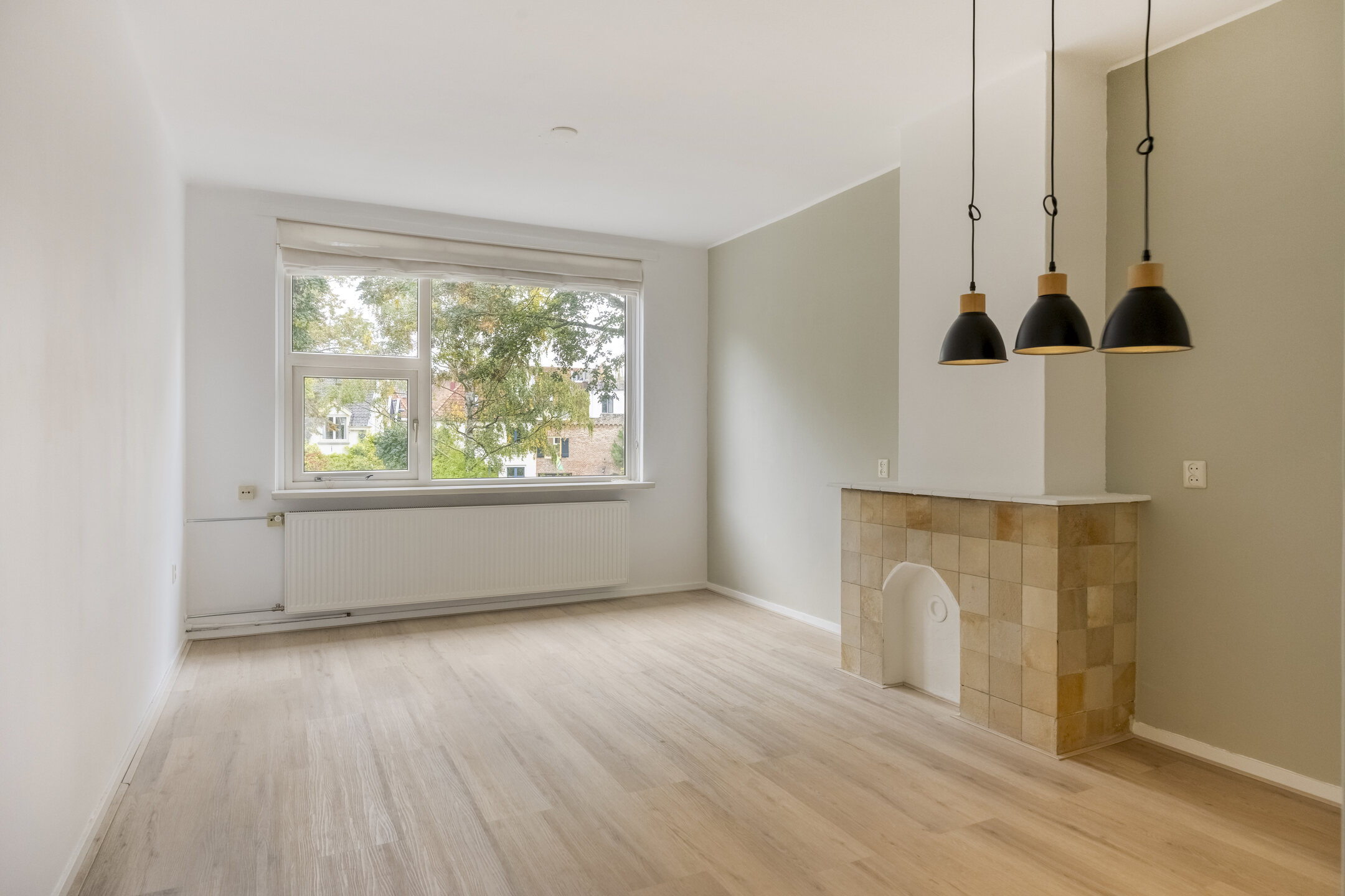 Nette afgewerkte L-vormige woonkamer met eet- en zithoek met fraaie en luxe pvcvloer (2024). Vanuit de woonkamer heeft u een werkelijk prachtig uitzicht op het centrum van de stad en groene oase aan de Berkel.
